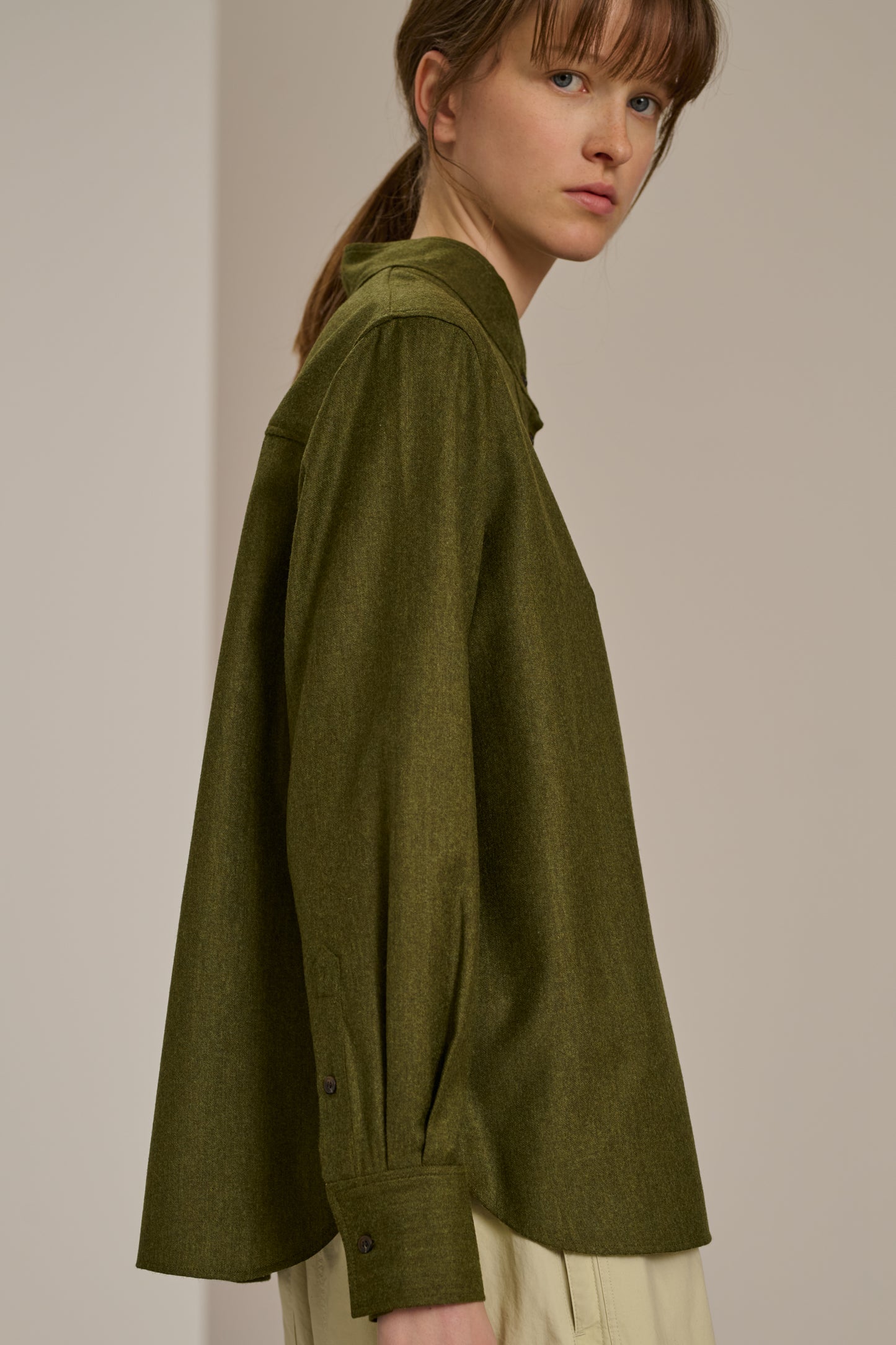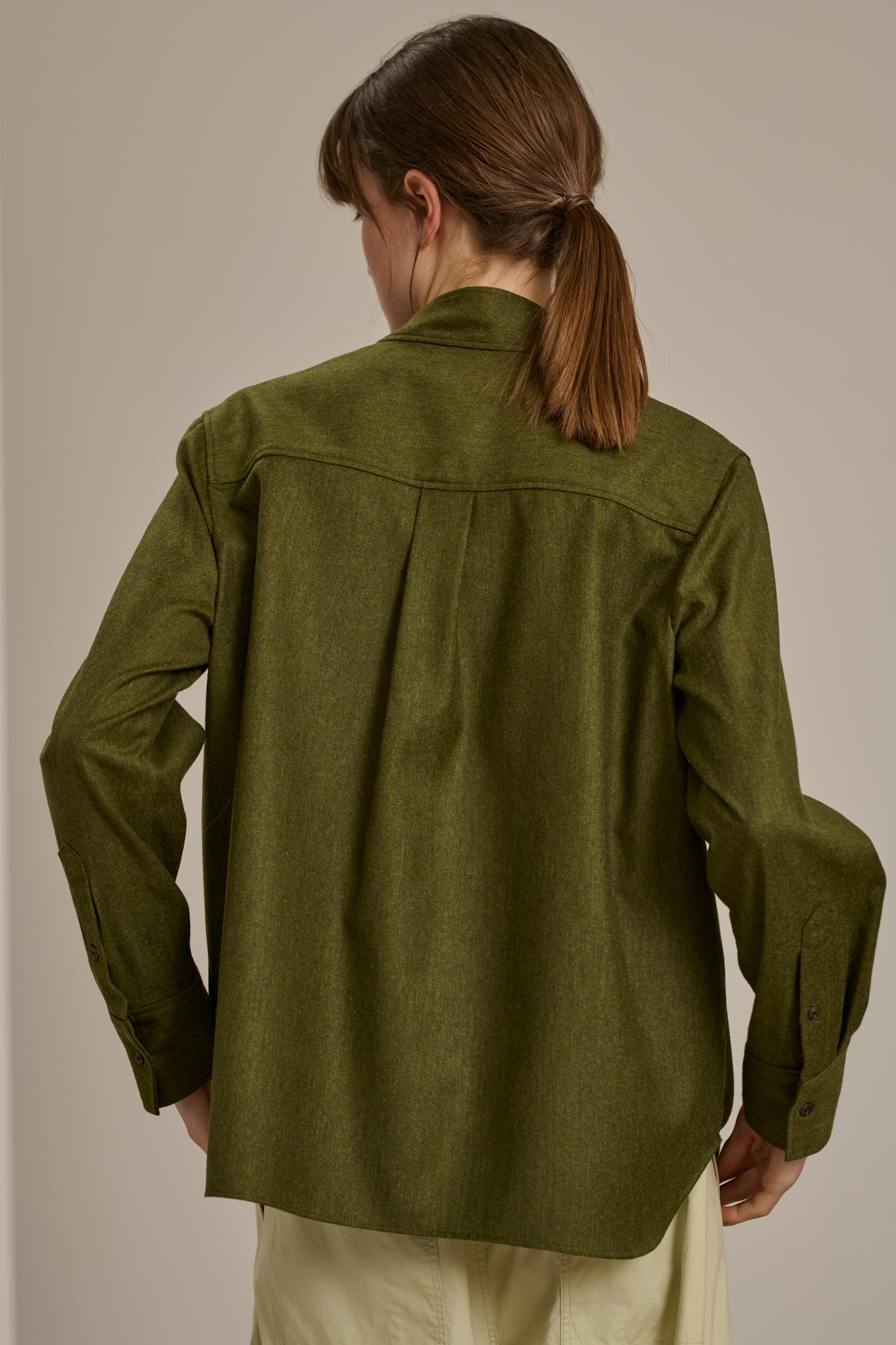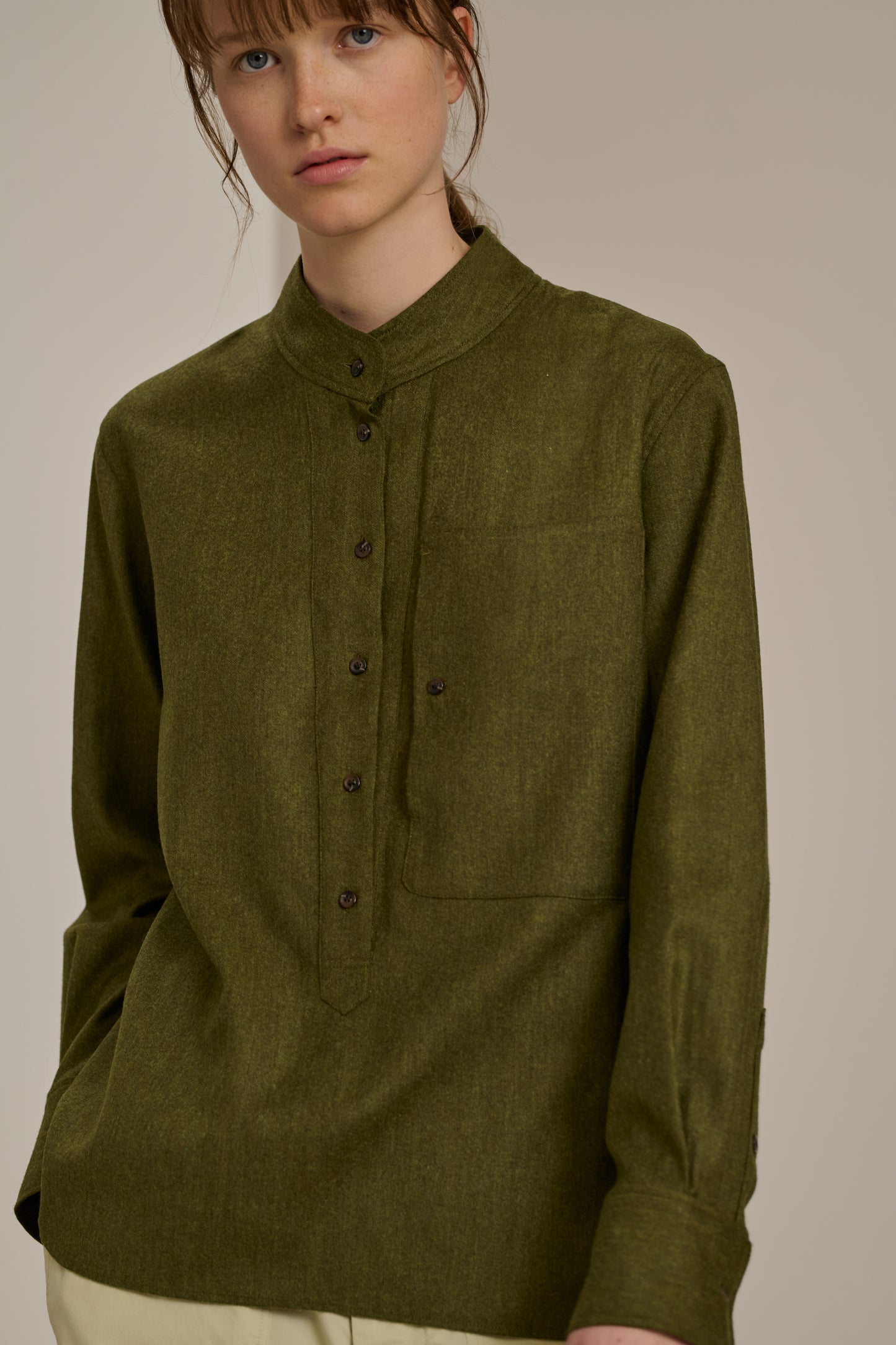 CROATIE est une blouse en flanelle chinée légère. Sa forme droite et ample garantit une silhouette fluide et décontractée, parfaite pour un look à la fois chic et confortable.