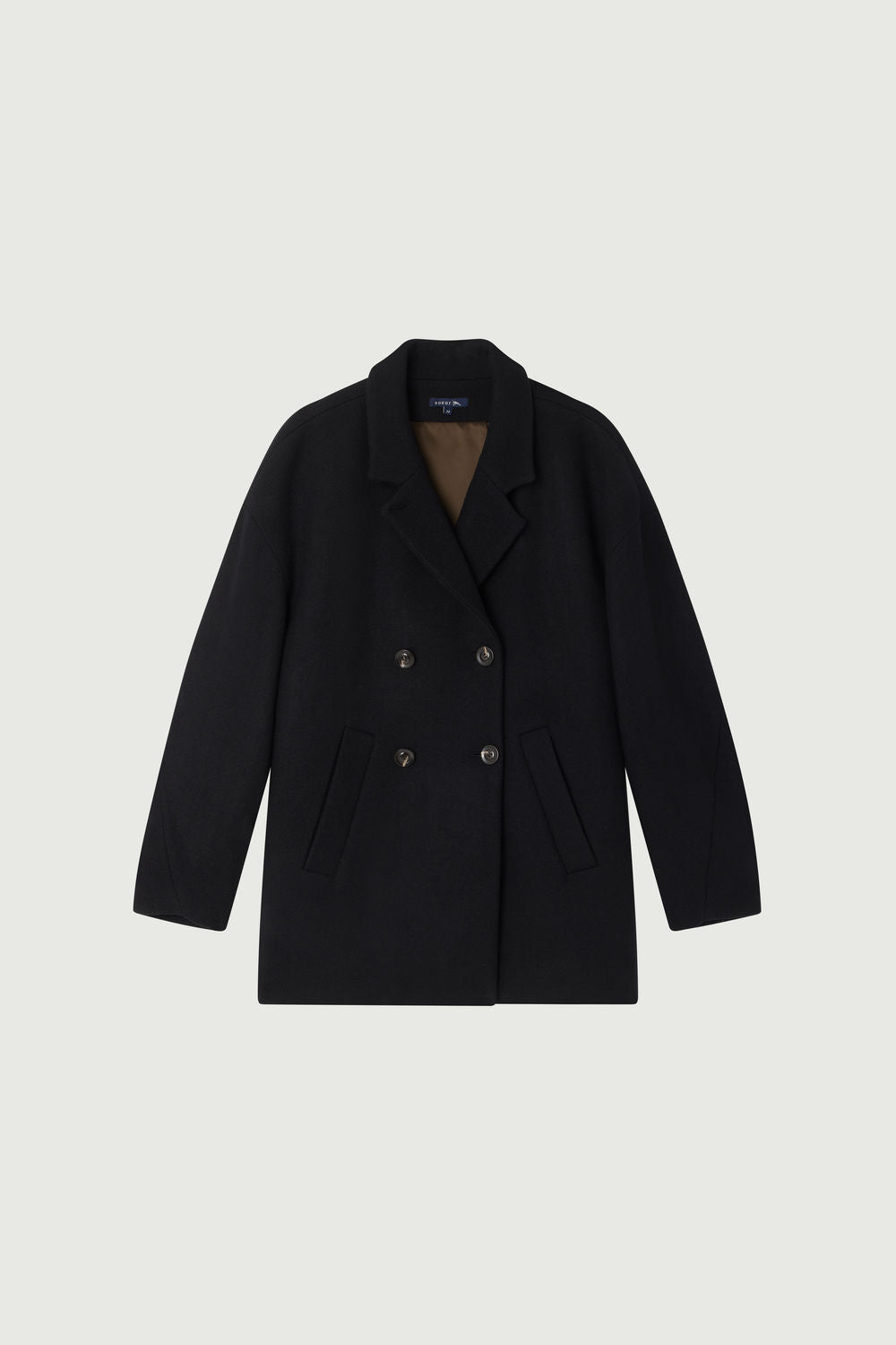 SALFORD est un manteau caban court à la forme ample et ronde. Confectionné en tweed double noir en laine. Il peut se porter avec le col ouvert ou fermé. Doté d'un double boutonnage et de deux poches passepoilées à l'avant, il combine élégance et intemporalité avec des manches rondes pour un confort optimal.