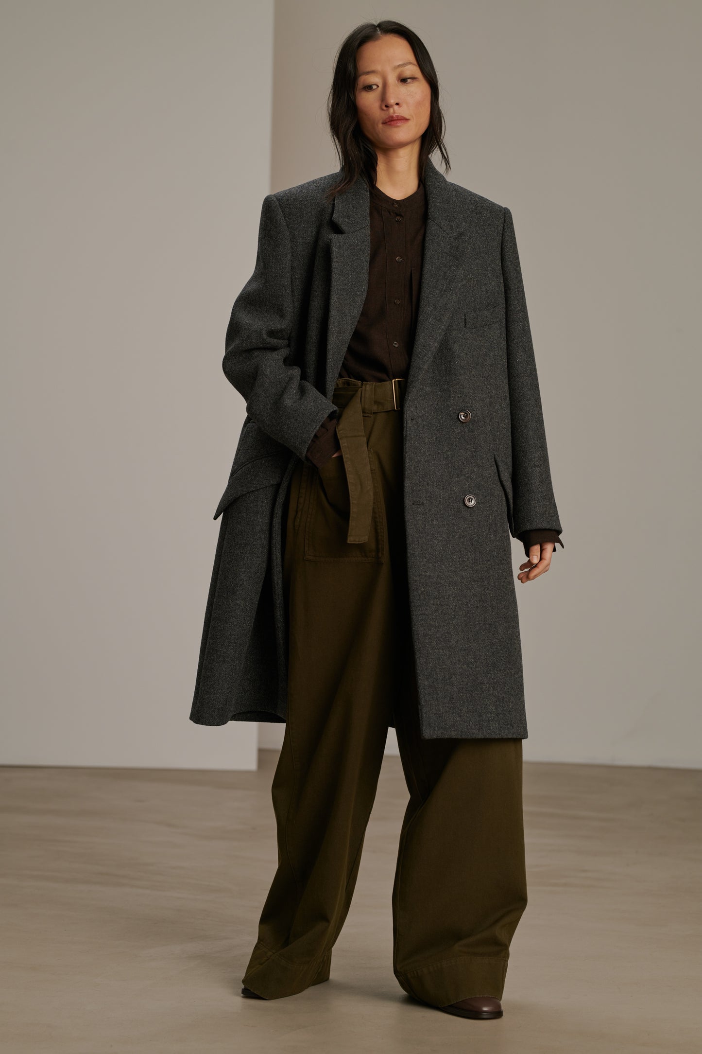 WADDEN est un manteau mi-long en tweed double gris chiné. Conçu avec un volume droit pour une silhouette épurée, il séduit par son look masculin intemporel. Doté d'un col tailleur élégant et d'une patte de boutonnage à l'avant, il allie style, sophistication et modernité.