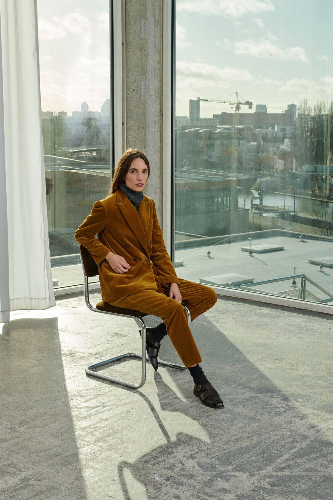 VIANNEY est un pantalon cigarette droit et ajusté. Un pli marqué le long de la jambe allonge la silhouette. Le velours lisse et duveteux apporte de la lumière et des reflets brillants à ce coloris bronze.