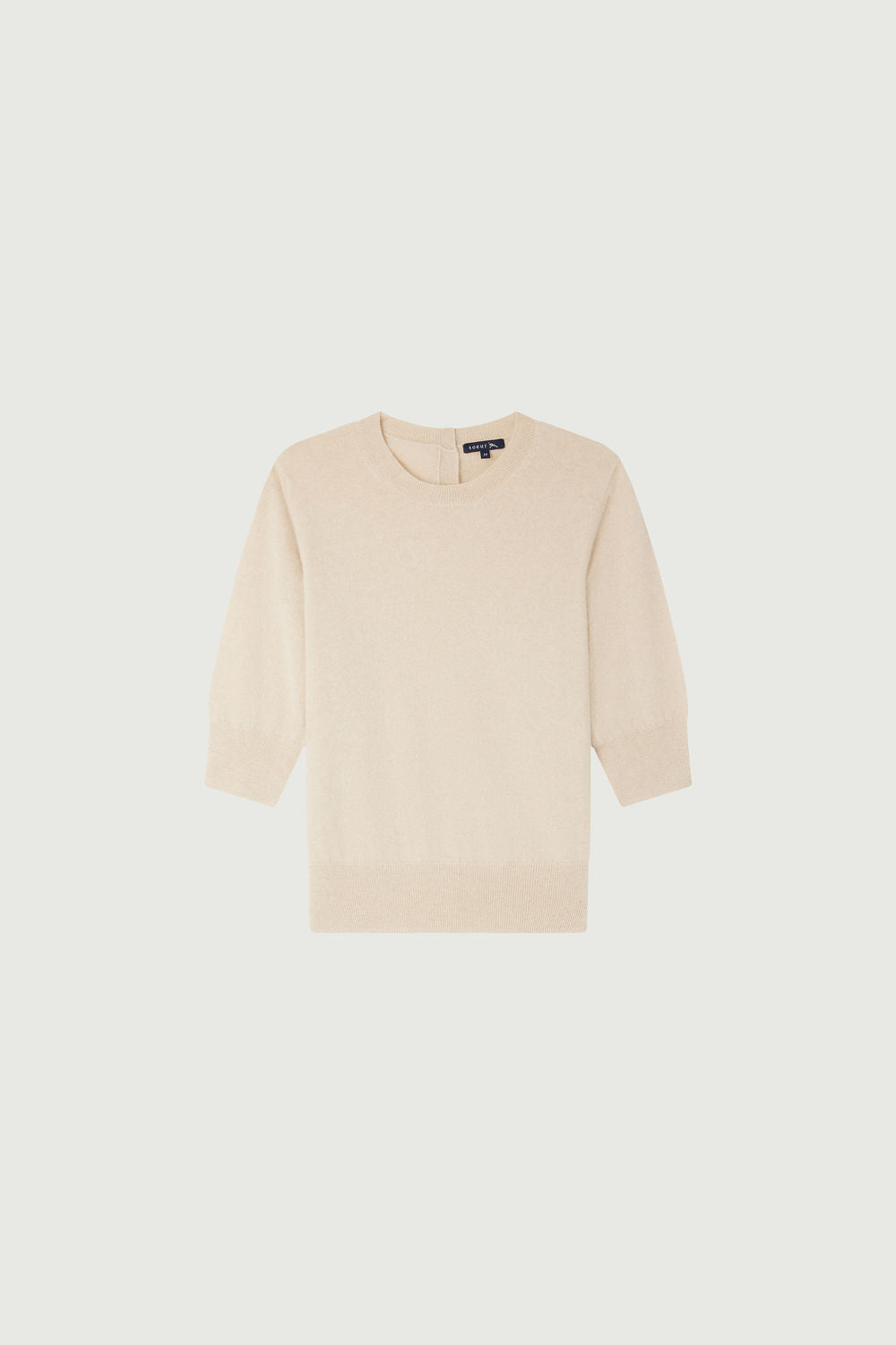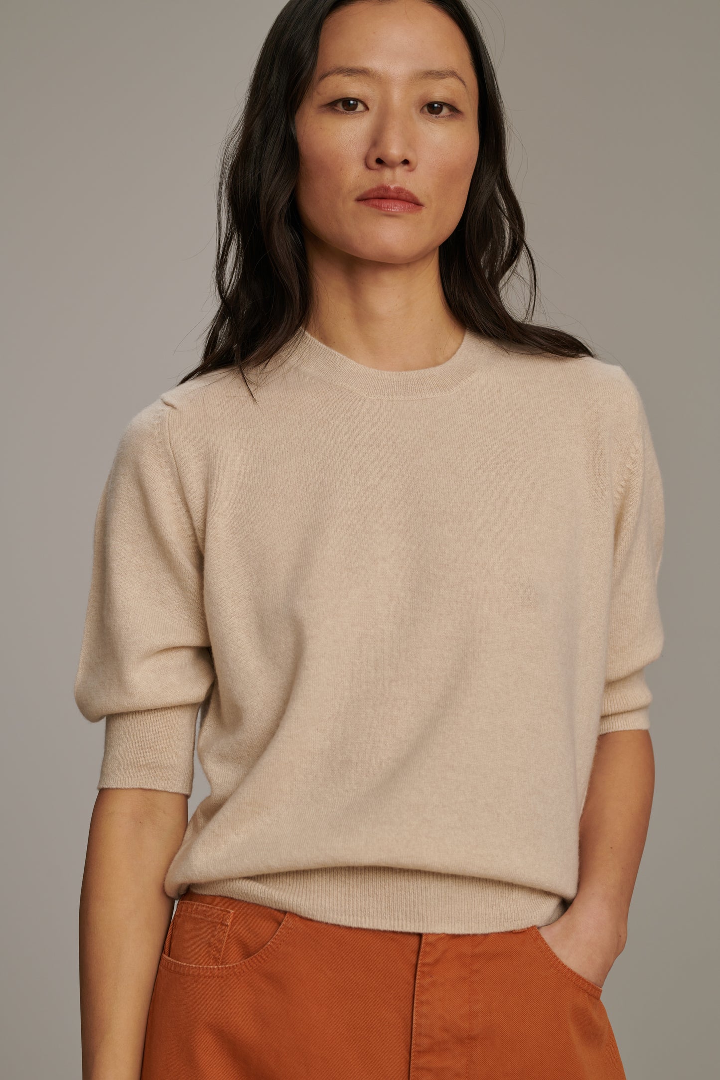 BAIE est un petit pull manches courtes, tel un tee-shirt d'hiver. Tricoté dans un fil de cachemire, sa douceur se porte à même la peau. Sa coupe est droite et ample, décollée du corps pour vous assurer confort et aisance.