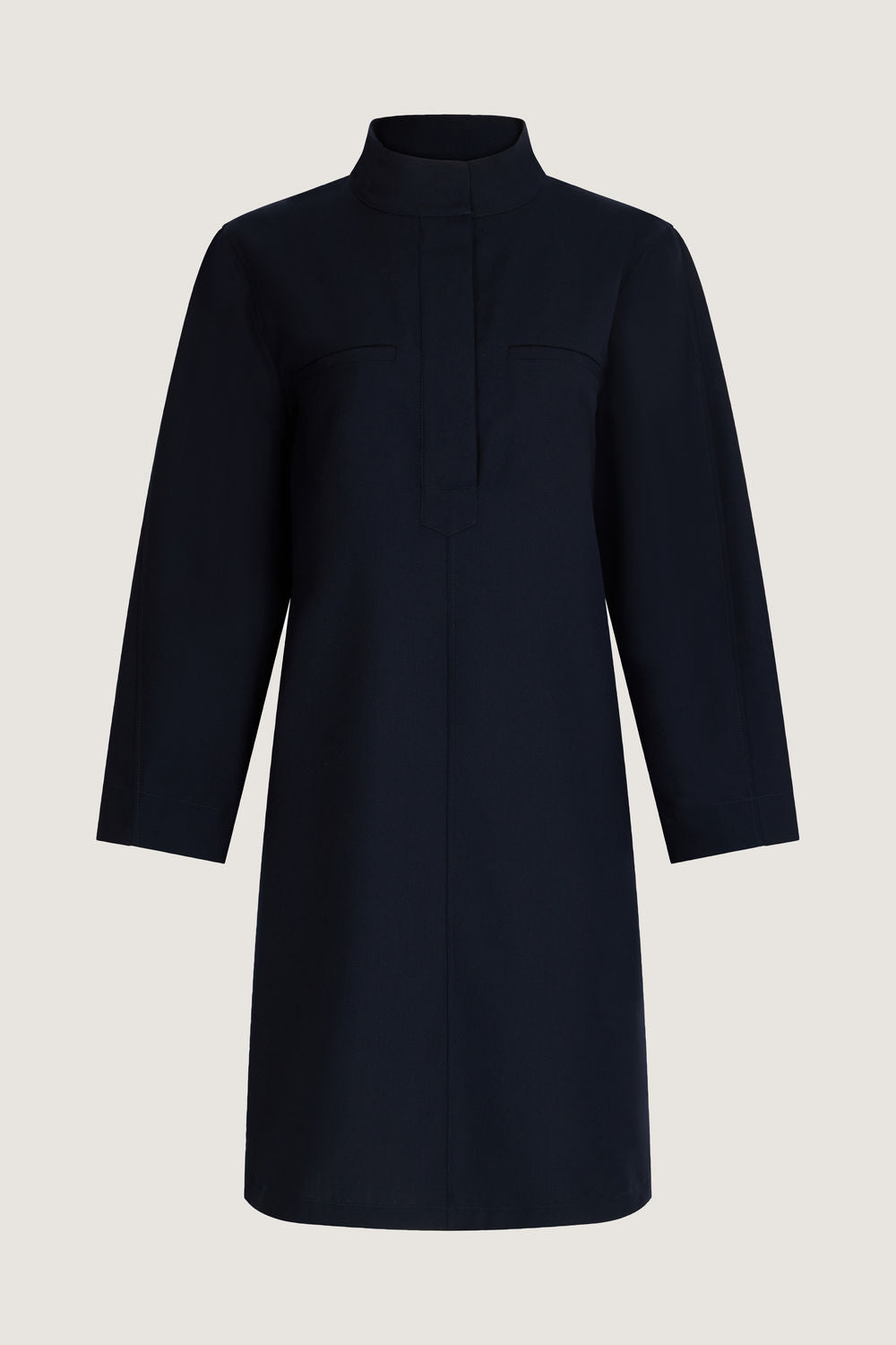 VENTURA est une robe courte en lainage fin et souple. Le pied de col légèrement montant peut se porter boutonné ou boutons défaits pour révéler le cou.